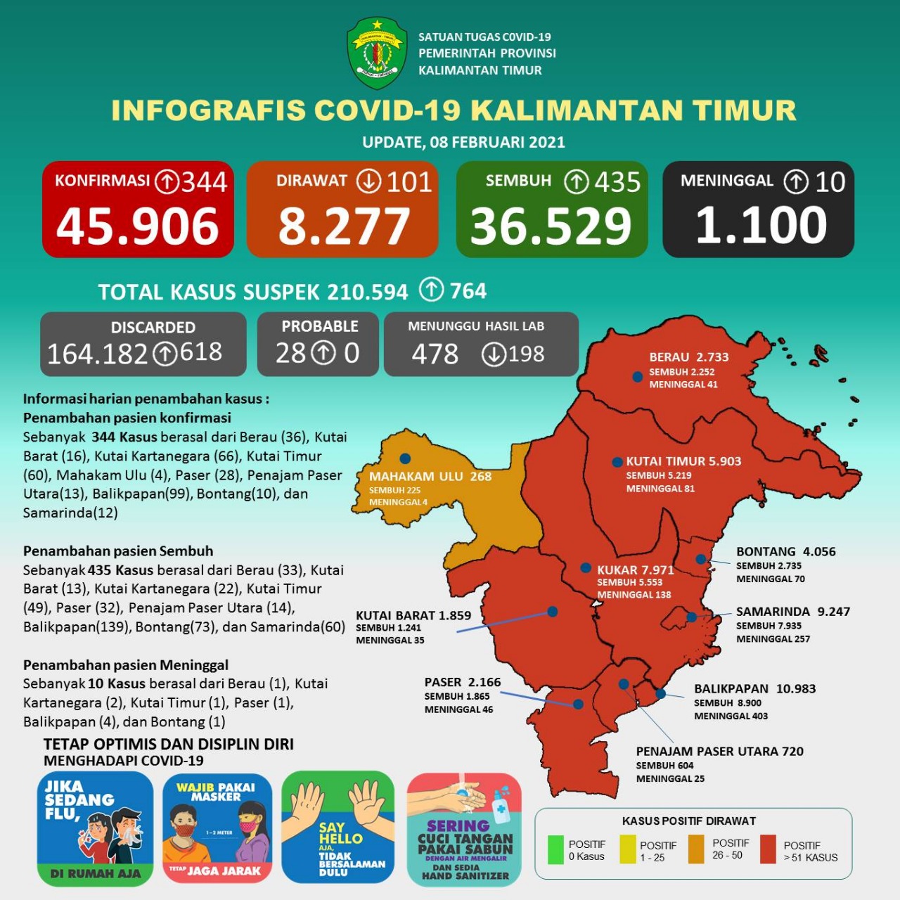 Update 8 Februari 2021 : Bertambah 344 Kasus Positif Covid-19 di Kaltim, 10 Kasus Kematian