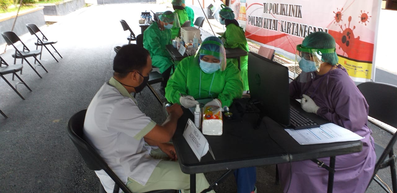 Kegiatan vaksinasi dilaksanakan di depan ruang poliklinik Polres Kukar dan yang divaksin yakni tenaga kesehatan Polri dan Umum yang sudah teregritrasi di P-Care Poliklinik Polres Kukar.