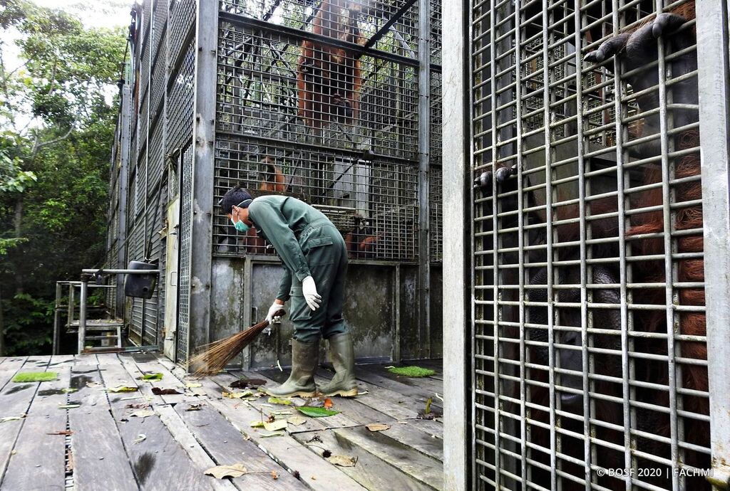Jadwal pemberian pakan orangutan di pusat rehabilitasi maupun di pulau pra-pelepasliaran pun masih seperti biasa, dua kali sehari, pagi dan sore. Pembersihan kandang orangutan juga tetap sama, di pagi dan sore hari setiap hari. Penyemprotan desinfektan tiga kali seminggu untuk memastikan kondisi pusat rehabilitasi tetap bersih dan sehat.