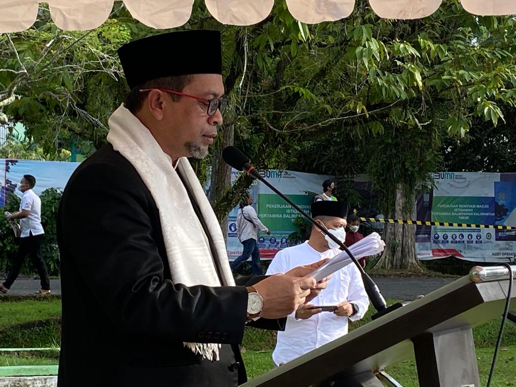 Pj Sekda Kota Balikpapan, Muhaimin didaulat membacakan sambutan Wali Kota Balikpapan Rahmad Mas’ud yang pada saat bersamaan sedang melaksanakan salat eid di Balikpapan Islamic Center.