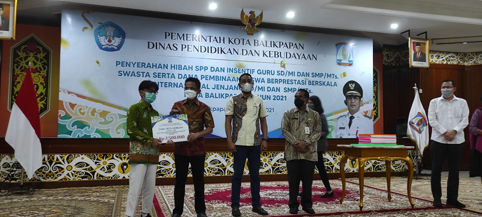 Penyerahan hibah SPP dan insentif guru SD,/MI dan SMP/MTs swasta serta dana pembinaan siswa berprestasi berskala internasional jenjang SD/MI dan SMP/MTs Kota Balikpapan, merupakan bagian program periotas kepala daerah 2021 dan 2022.