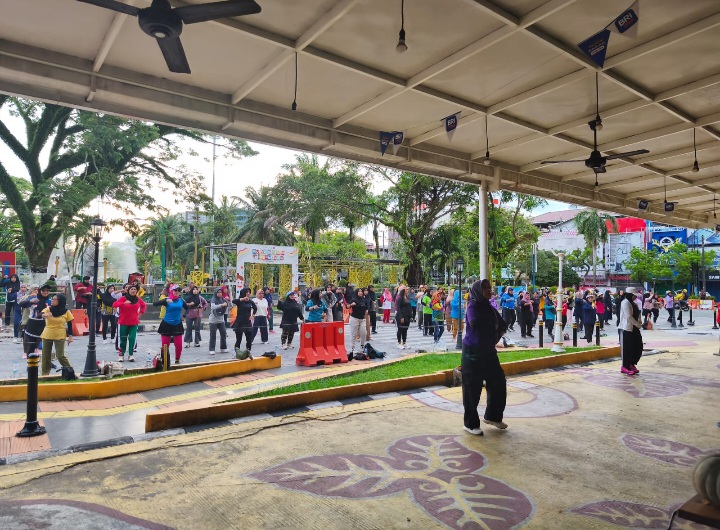 Kegiatan yang dimulai pukul 07.00 WITA berlangsung di bawah area beratap fasilitas publik tersebut, dengan barisan peserta meluas hingga ke ruang terbuka sekitarnya. Dipandu oleh instruktur profesional di bagian depan, para peserta tampak kompak mengikuti setiap gerakan dengan penuh semangat, menciptakan atmosfer kebersamaan yang hangat di tengah kota.
