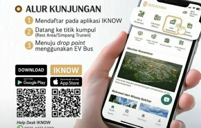 Aplikasi IKNOW dapat Anda unduh gratis melalui Play Store dan App Store. Pengunjung harus mendaftar melalui aplikasi ini sebelum memasuki area IKN. Berikut langkah pendaftarannya: