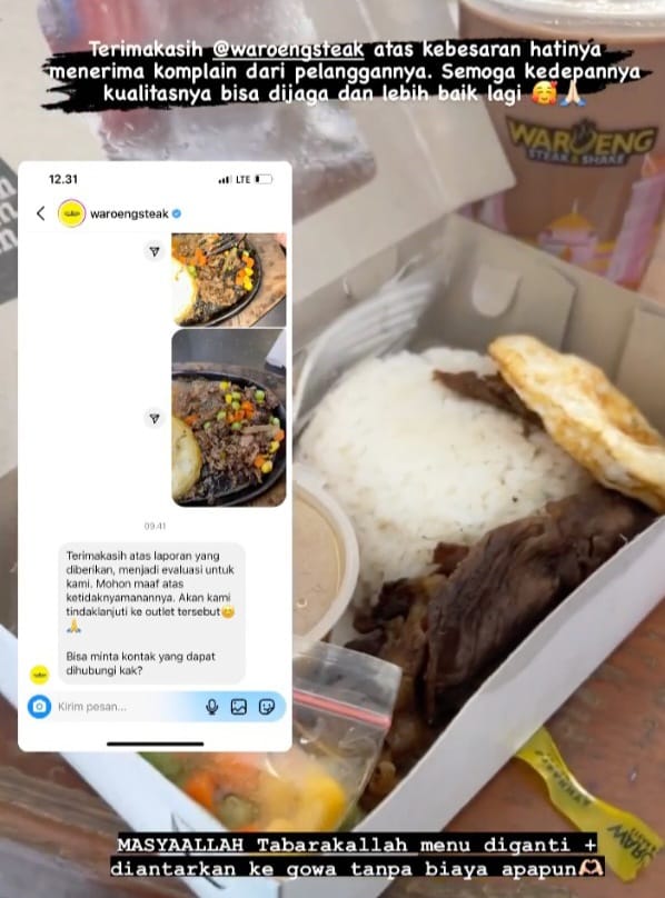 “Terima kasih @waroengsteak atas kebesaran hatinya menerima komplain dari pelanggannya. Semoga ke depannya kualitasnya bisa dijaga dan lebih baik lagi,” ujarnya bangga.