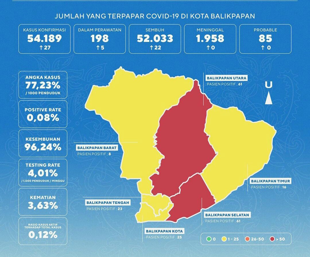 Saat ini total kasus aktif COVID-19 di Kota Balikpapan sebanyak 198 orang. Adapun kumulatif sejak awal pandemi seluruhnya 54.189 kasus, pasien sembuh 52.033 kasus dan 1.958 kasus kematian.
